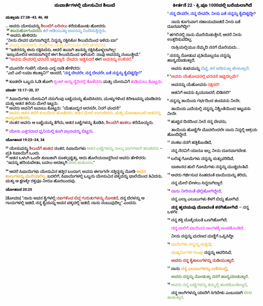 ನೀವು 22 ನೇ ಕೀರ್ತನೆಯನ್ನು ಸಂಪೂರ್ಣವಾಗಿ ಇಲ್ಲಿ ಓದಬಹುದು. ಕೆಳಗಿನ ಪಟ್ಟಿಯು, ಹೋಲಿಕೆಗಳನ್ನು ಎತ್ತಿ ಹಿಡಿಯಲು ಬಣ್ಣ-ಹೊಂದಾಣಿಕೆಯೊಂದಿಗೆ, ಸುವಾರ್ತೆಗಳಲ್ಲಿ ದಾಖಲಾದ ಯೇಸುವಿನ ಶಿಲುಬೆಗೇರಿಸುವಿಕೆಯ ವಿವರಣೆಯೊಂದಿಗೆ 22 ನೇ ಕೀರ್ತನೆಯನ್ನು ಅಕ್ಕಪಕ್ಕದಲ್ಲಿ ತೋರಿಸುತ್ತದೆ.